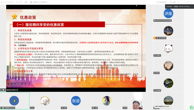 为进一步加强家校沟通,增进家长对员工就业及征兵政策的了解,同时积极响应国家征兵号召,鼓励毕业生投身军旅,6月7日,公司通过腾讯会议成功举办了2025届毕业生家长会暨征兵政策宣讲会,辅导员李璐璐主持,部分毕业生家长参会。