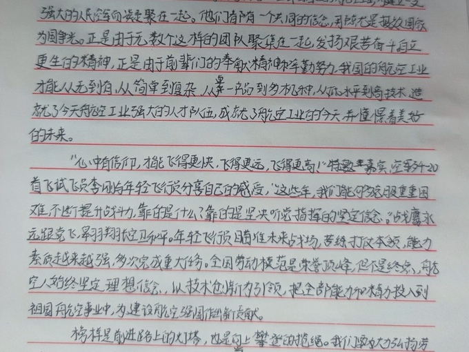活动期间,同学们紧扣“航空情.报国志”主题,以个人与民族、国家、社会和新时代的关系为叙述角度,围绕我国航空事业发展史,结合航空业典型案例,向我们展现了他们对“航空报国、航空强国”这一句话的独特见解。参赛作品中不仅包含古人追寻飞天梦想不断探索的精神,还简括了冯如为开拓和发展我国航空事业奋斗一生、至死不渝的感人故事。同学们以文字的形式,充分展现了一代代航空人发扬“忠诚奉献,逐梦蓝天”的航空报国精神,以及其淡泊名利、甘于奉献、坚守担当、攻坚克难的崇高品质。活动结束后,同学们纷纷表示会树立远大志向,在航空报国精神的指引下,以高度的使命感和责任感,为学校建设以航空为主要特色的高水平应用型大学而贡献青春力量。